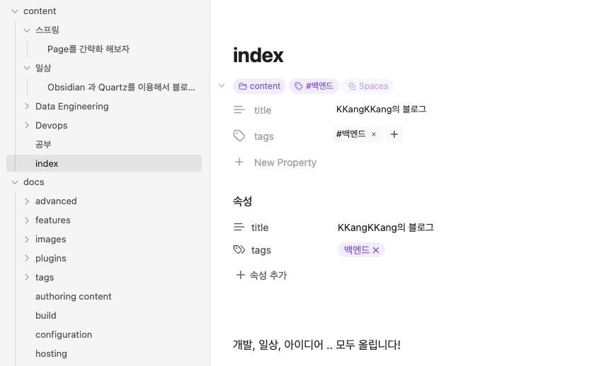 이후 화면 뜨면 index 부분이 메인?화면 이기에 아무 말이나 써준다. (이때 content 폴더에 글들을 작성해야 한다!)