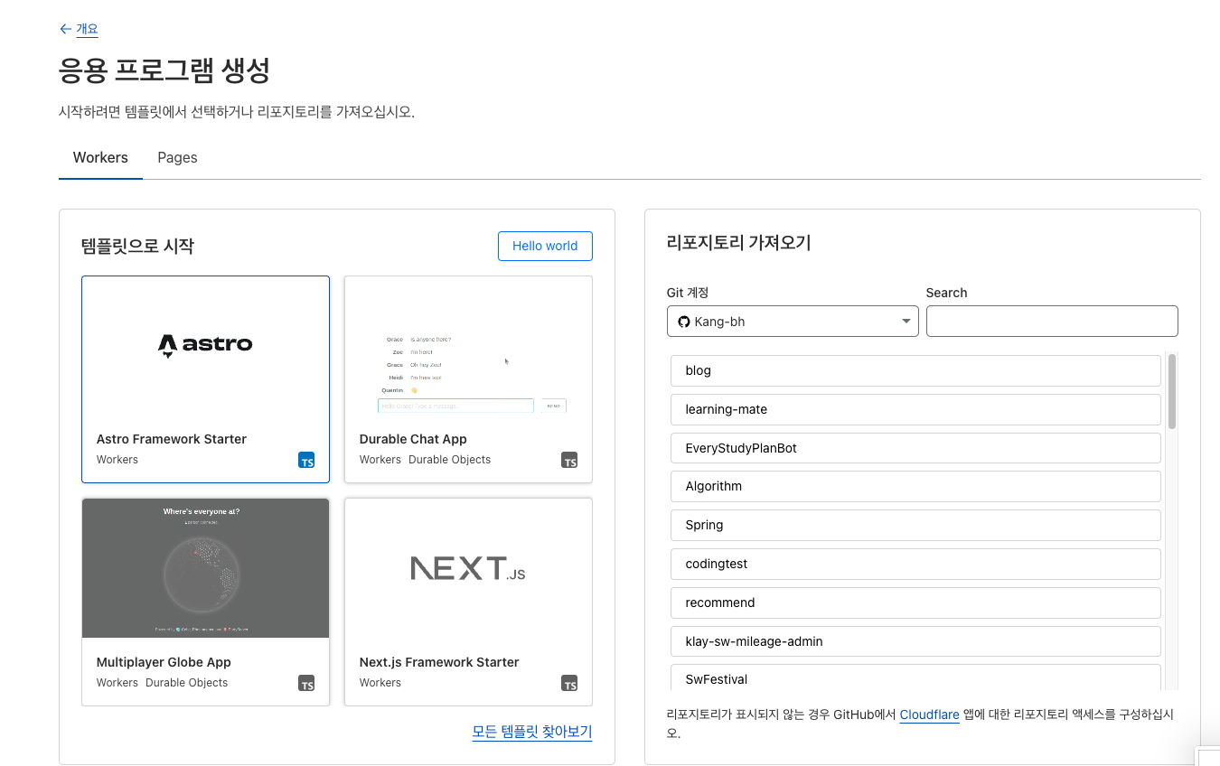 해당 부분에 들어와서 Workers 및 Pages에서 생성버튼을 누르면 다음과 같은 화면이 뜬다.